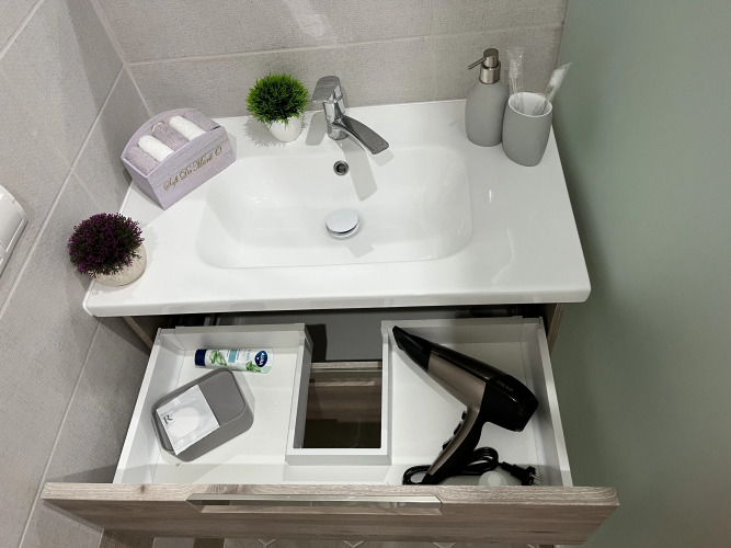 В наличии: двуспальная кровать с ортопедическим матрасом, ванная комната с тёплым полом, есть душ, предоставляются полотенца и средства гигиены. Возможно воспользоваться стиральной машинкой, так же есть сушилка, гладильная доска и утюг. Кухня оснащена холодильником, варочный поверхностью, духовым шкафом и микроволновой печью. В кухонных шкафчиках есть набор кастрюль, сковороды и наборы для пикников.