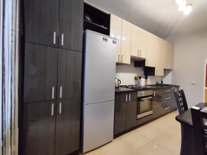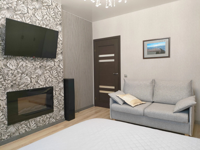 Основное спальное место — двуспальная кровать 160х200 с ортопедическим матрасом. Дополнительное спальное место — диван-кровать 140х200. На отдельной кухне — холодильник, духовка, вытяжка, микроволновка, мультиварка, тостер, чайник, необходимая посуда, гейзерная кофеварка, турка, френч. Имеются сейф, фен, утюг, сушилка, шкафы для одежды, рабочий стол для ПК, стиральная машина, пылесос. Для развлечений: кабельное ТВ, Wi-Fi, частная видеотека с 2500 фильмов, аудиотека с концертами, аудио-колонки, электрокамин.