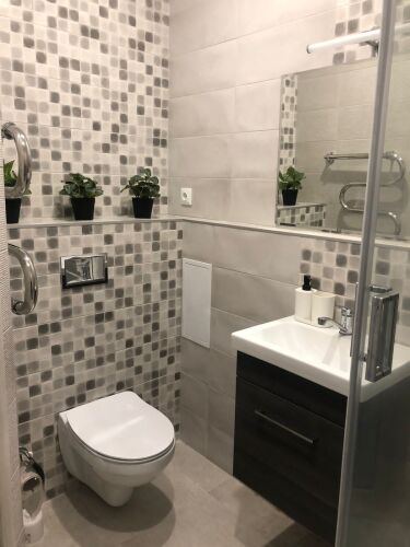В санузле есть душевая кабина с капельным тропическим душем, умывальник, инсталляция, стиральная машина, сушилка для белья, фен, полотенца. В коридоре — шкаф для одежды, зеркало, гладильная доска, утюг.