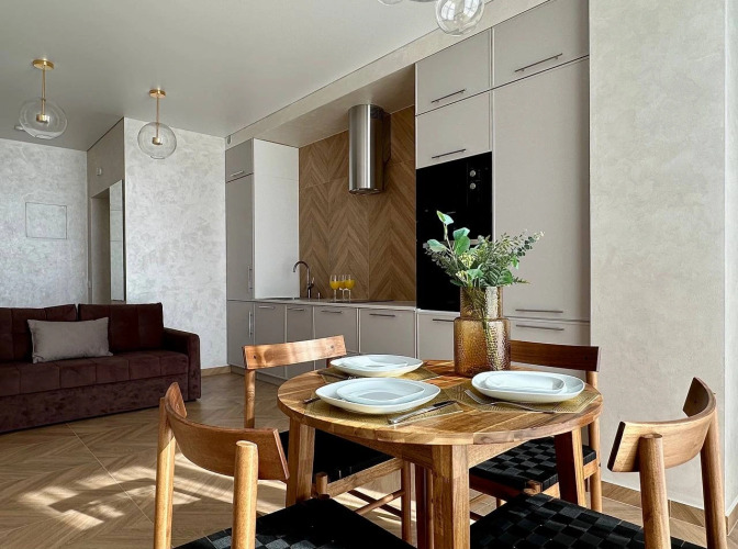 Апартаменты оборудованы для пребывания двух гостей. К услугам гостей спальня и кухня-гостиная, оформленные в тёплых тонах. В апартаментах есть: постельное бельё: одеяло и две подушки; полотенца: банное и полотенце для рук; мини-утюг, стиральная машина, фен, сушилка для белья, мини гладильная доска, пылесос, кондиционер, тёплый пол, москитные сетки, Wi-Fi.