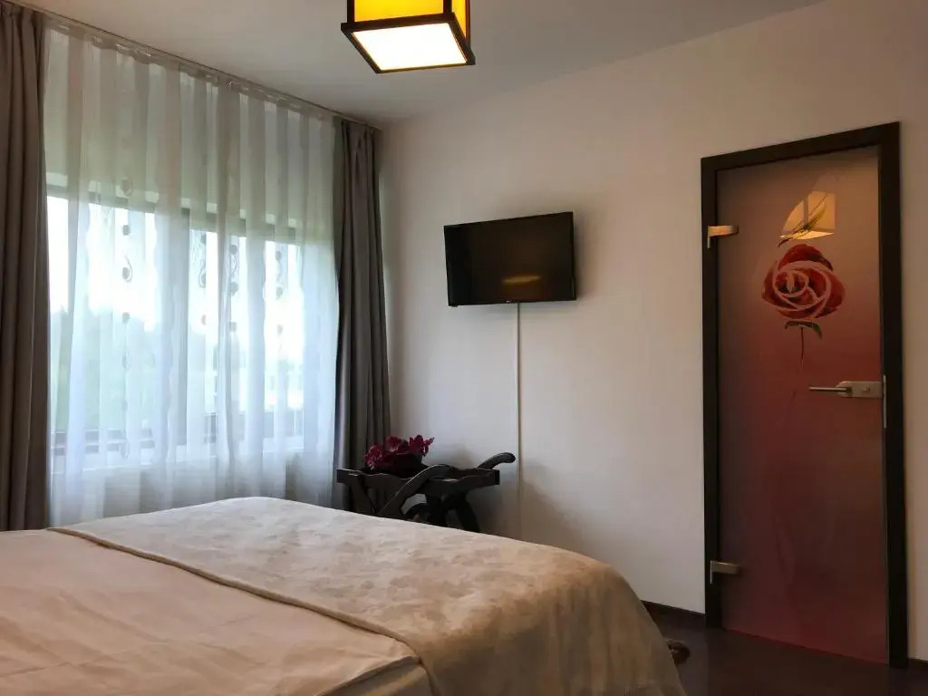 В номере вы найдёте телевизор и тапочки. Оснащение зависит от выбранной категории номера.
