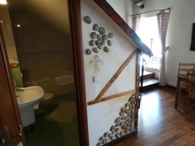 В номере вы найдёте душ, телевизор и тапочки. Оснащение зависит от выбранной категории номера.