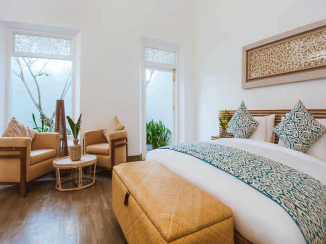 Номер уютно обставлен и оснащён необходимым, чтобы отдохнуть после долгого и насыщенного дня. Имеются DVD-плеер, телевизор, мини-бар и халат. Оснащение зависит от выбранной категории номера.