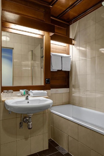 В номере вы найдёте телевизор, халат и тапочки. Оснащение зависит от выбранной категории номера.