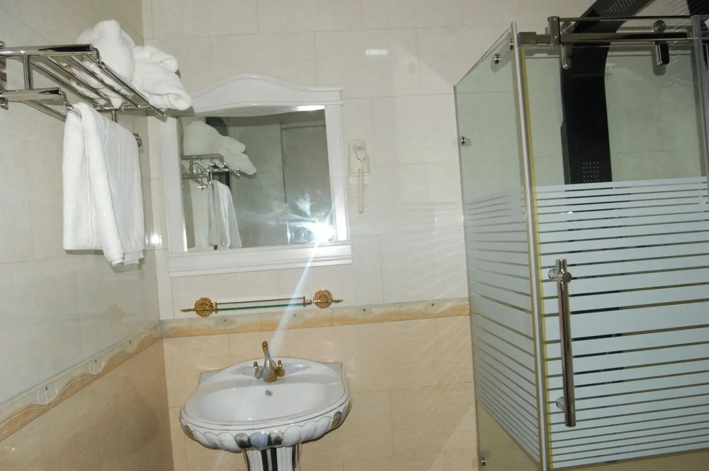 В номере гостей ждут душ, телевизор и тапочки. Оснащение зависит от выбранной категории номера.