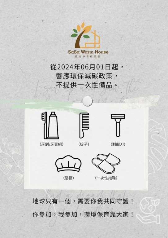 В связи с правительственными постановлениями, направленными на сокращение отходов, начиная с 1 января 2025 года, в отелях на Тайване будет ограничено использование одноразовых принадлежностей (таких как шапочка для душа, расчёска, зубная щётка, зубная паста, бритва, крем для бритья и т. д.). Гостям рекомендуется привозить свои собственные принадлежности.