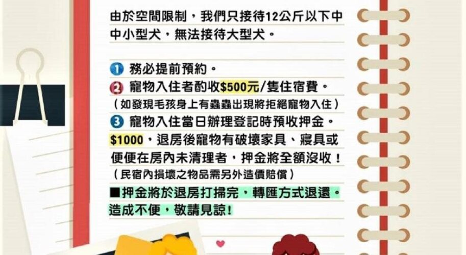 Необходимо внести депозит за размещение с домашними животными. Стоимость: 1,000.00 TWD с гостя за всё время пребывания.