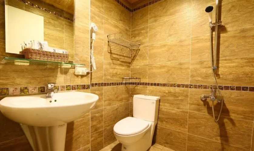 В номере вы найдёте душ, телевизор и тапочки. Оснащение зависит от выбранной категории номера.