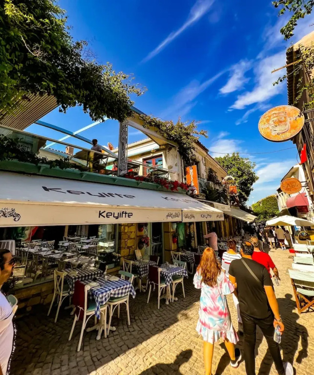 Отель Keyifte Alaçatı, адрес на карте Алакати, Yenimecidiye Mah. Kemalpasa Cad. No 77, с описанием номеров и правом онлайн бронирования на ресурсе ВашОтель.RU , цены проживания и удобства.