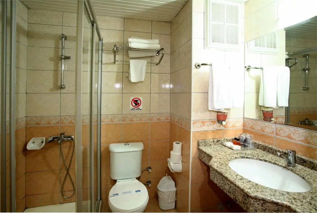 В номере вы найдёте душ, телевизор и тапочки. Оснащение зависит от выбранной категории номера.