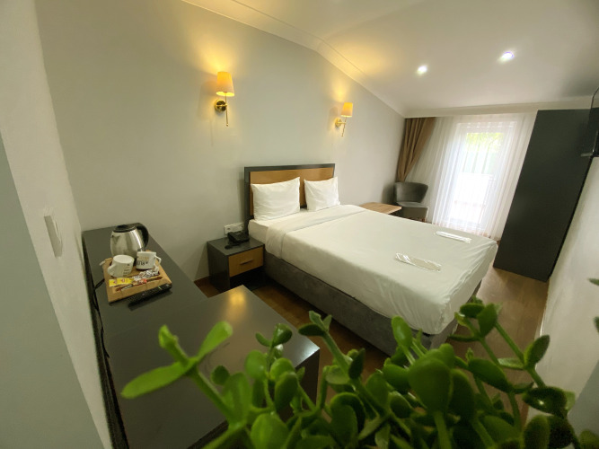 Номер уютно обставлен и оснащён необходимым, чтобы отдохнуть после долгого и насыщенного дня. Имеются халат. Оснащение зависит от выбранной категории номера.