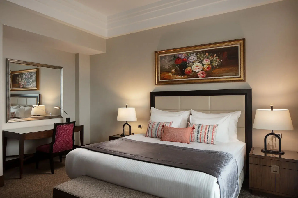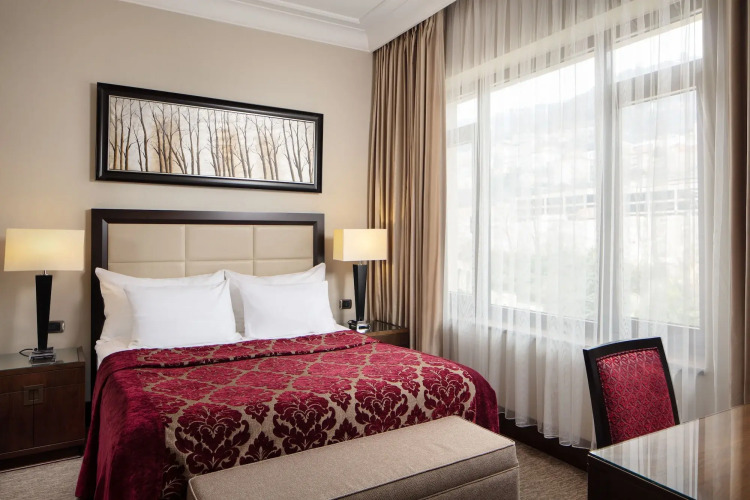 В номере вас будут ждать DVD-плеер, телевизор, мини-бар, халат и тапочки. Перечисленные услуги есть не во всех номерах.
