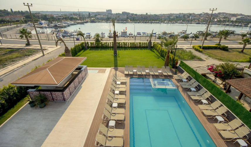 Подходящий вариант для бюджетного отдыха — отель «Dalian Elite Hotel» находится в Чешме. Этот отель располагается в 3 км от центра города. Рядом с отелем — Порт Хиос.