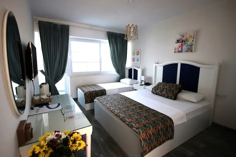 Отель Mavi Beyaz Butik Otel, адрес на карте Эрдемли, Ayas Mahallesi Atatürk Caddesi, с описанием номеров и доступностью онлайн бронирования на площадке vashotel.ru , стоимость проживания и удобства.