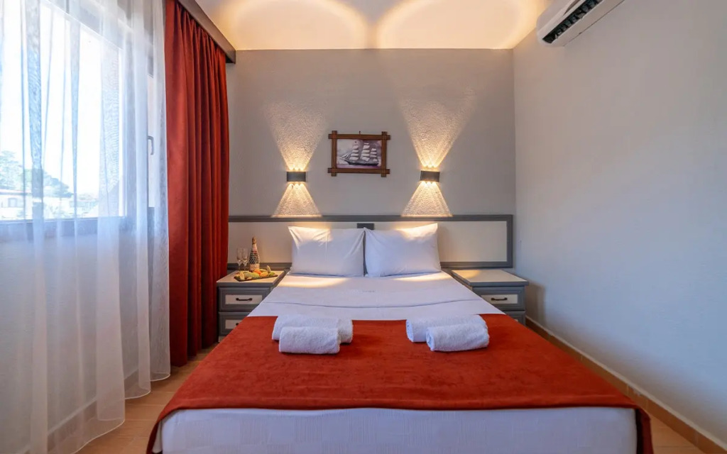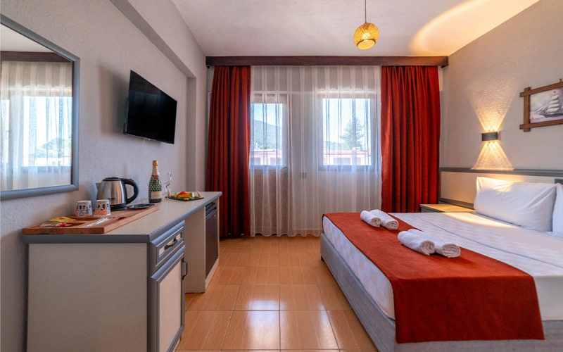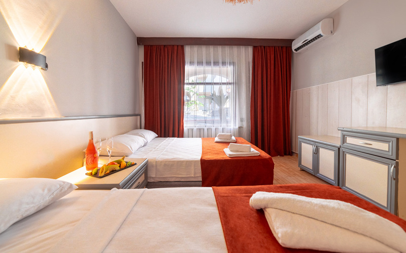 В номере вы найдёте DVD-плеер, телевизор, мини-бар и халат. Оснащение зависит от выбранной категории номера.