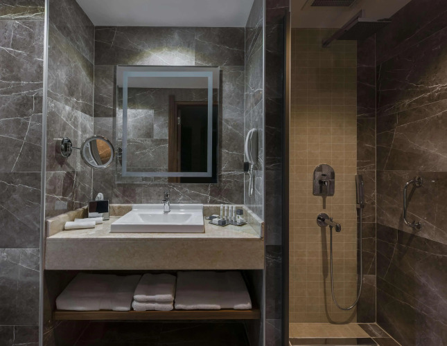В номере вас будут ждать мини-бар и тапочки. Оснащение зависит от выбранной категории номера.
