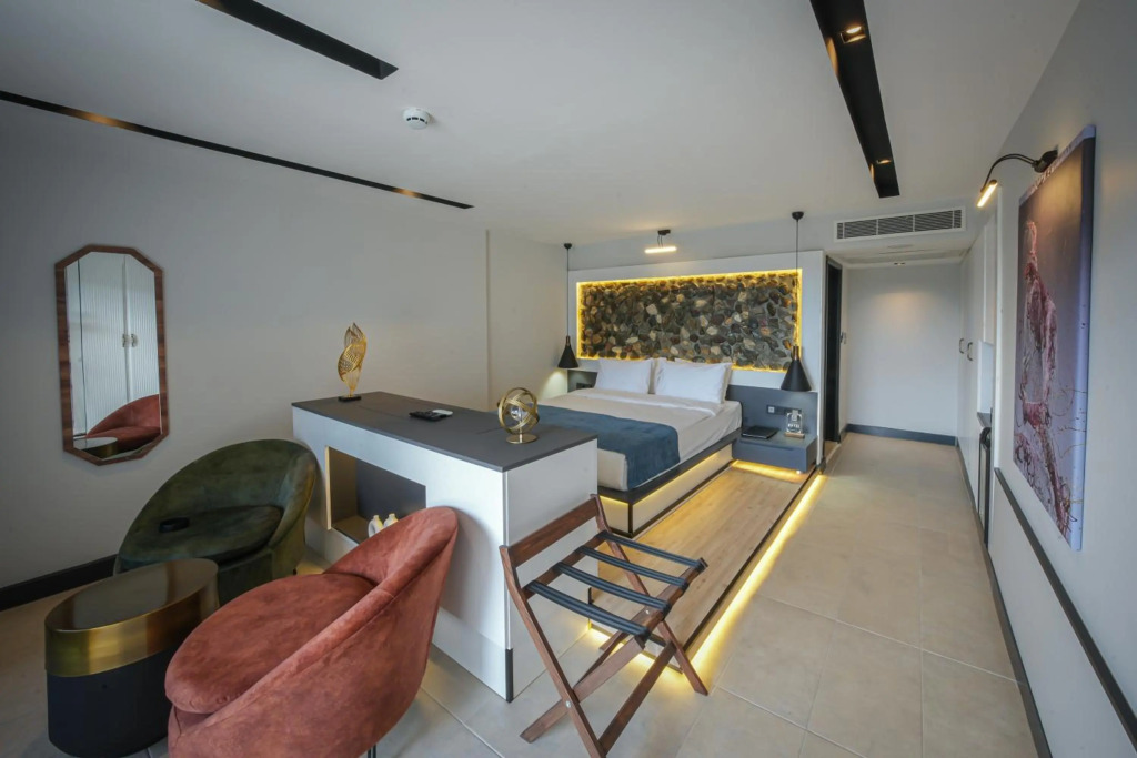 Номер уютно обставлен и оснащён необходимым, чтобы отдохнуть после долгого и насыщенного дня. Имеются телевизор, мини-бар и тапочки. Оснащение зависит от выбранной категории номера.