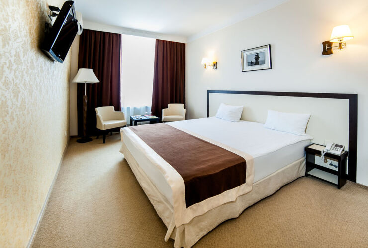 Номер уютно обставлен и оснащён необходимым, чтобы отдохнуть после долгого и насыщенного дня. Имеются телевизор, мини-бар и тапочки. Перечисленные услуги есть не во всех номерах.