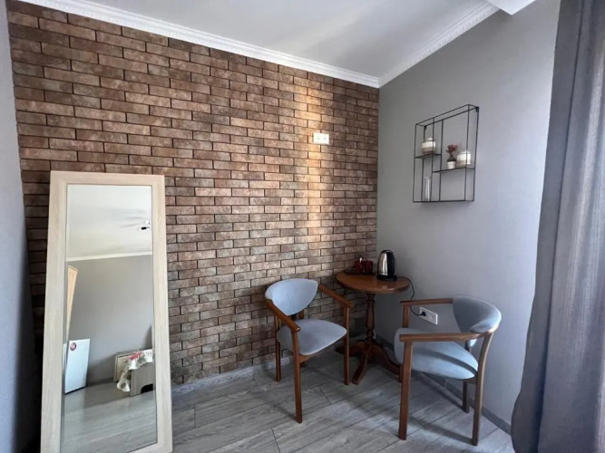 В номере вы найдёте душ, телевизор и тапочки. Оснащение зависит от выбранной категории номера.