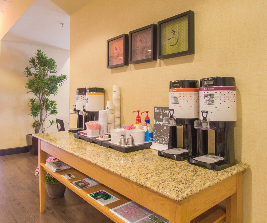 Каждое утро в отеле Hampton Inn Greenville сервируется бесплатный завтрак "шведский стол" с горячими и холодными блюдами. В холле вы можете самостоятельно приготовить кофе и разогреть еду в микроволновой печи. При необходимости, спросите совета у персонала, и вы получите исчерпывающую информацию о том, где поесть и купить те или иные продукты.