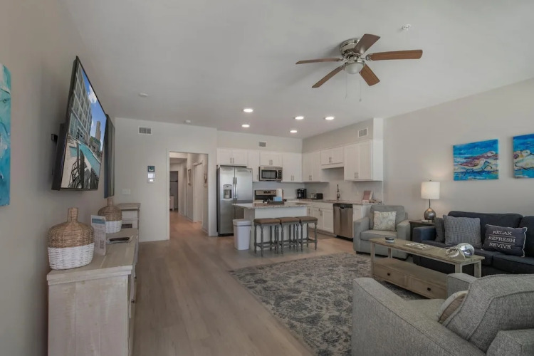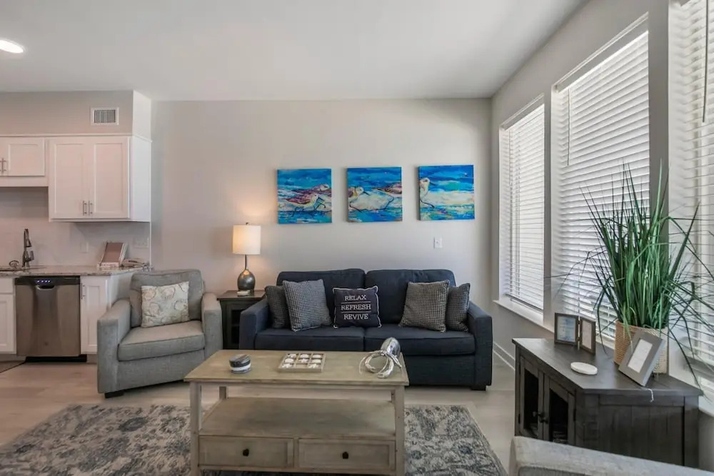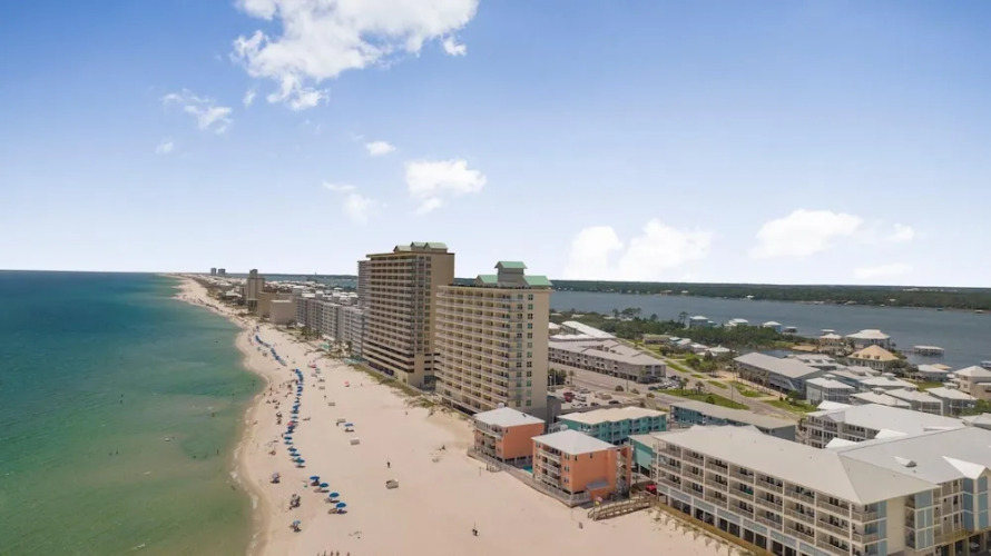 Подходящий вариант для большой компании: апартаменты «Sea Glass 403» находятся в Галф-Шорc. Эти апартаменты расположены в центре города. Утром — выпейте кофе, наблюдая из окна за жизнью города. Рядом с апартаментами — Пляжи Гальф-Шоз и Hangout Music Fest.