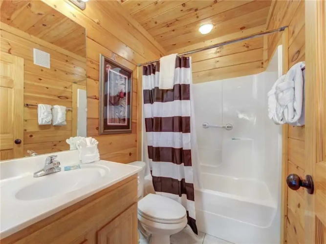 Отель Bear Creek Lodge Covered Bridge - Five Bedroom Cabin 3 звезды, адрес на карте Пиджен-Фордж, 2012 Bear Creek Way #47, с характеристиками номеров и возможностью онлайн бронирования на ресурсе vashotel.ru , стоимость проживания и удобства.