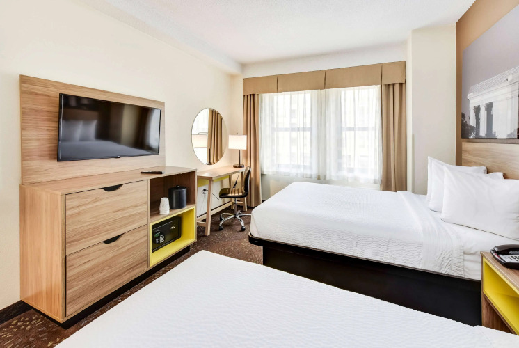 Отель Days Inn Connecticut Ave предлагает 155 двухместных номеров с двумя двуспальными кроватями. В номерах имеются ванные комнаты, мини-бары, бесплатный Wi-Fi спутниковое и кабельное телевидение. Для удобства гостей предоставляются также стол, кофеварка, телефон, фен и радиочасы.