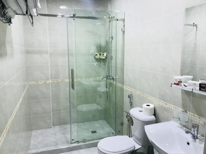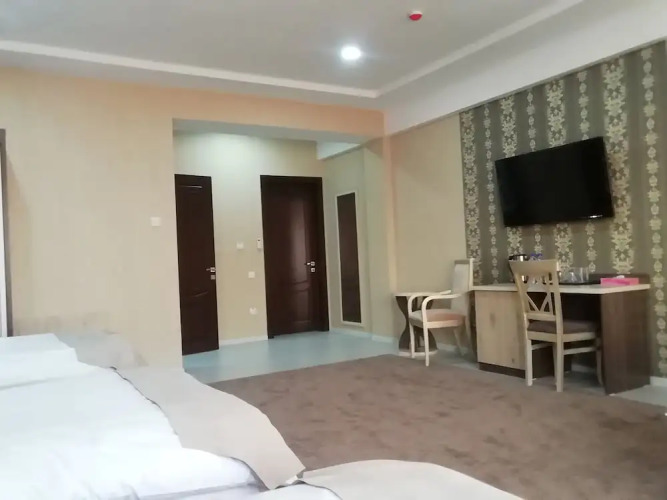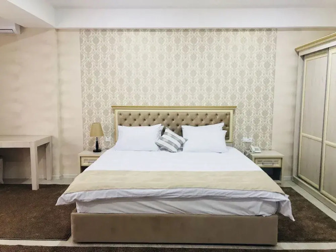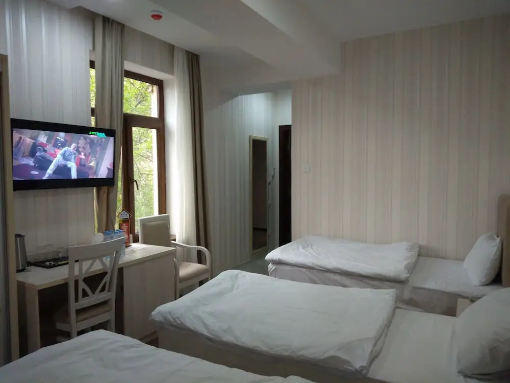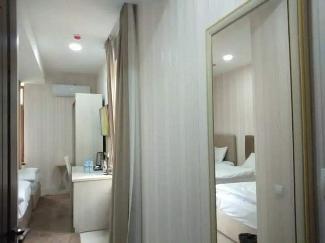 В номере вы найдёте душ, телевизор и тапочки. Оснащение зависит от выбранной категории номера.