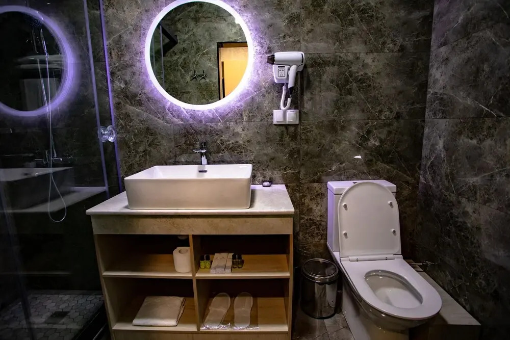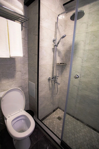 В номере вас будут ждать душ, телевизор и тапочки. Оснащение зависит от выбранной категории номера.