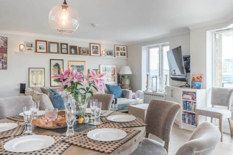 Отель Stunning Riverside home in Battersea, адрес на карте Лондон, Flat 8 Groveside Court, 4 Lombard Road Wandsworth, Battersea, с характеристиками номеров и доступностью онлайн бронирования на ресурсе vashotel.ru , цены проживания и удобства.