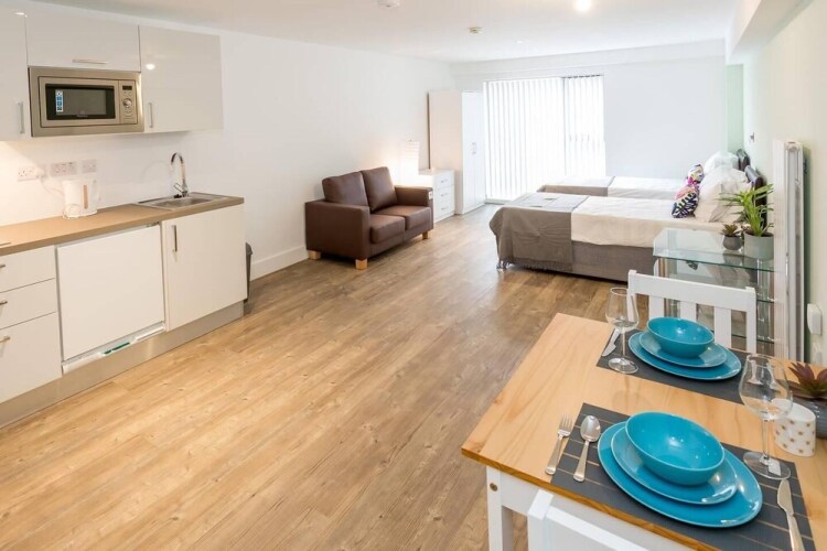 Отель Twin Studio near Manchester!, адрес на карте Олдем, Cardinal Court, Cardinal Str, Oldham, с описанием номеров и доступностью онлайн бронирования на ресурсе vashotel.ru , стоимость проживания и удобства.