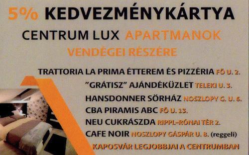 Выбор туристов, которые хотят везде чувствовать себя как дома — апартаменты «Centrum Lux Apartman» находятся в Капошваре. Эти апартаменты расположены в центре города. Перед сном есть возможность прогуляться вдоль главных достопримечательностей.