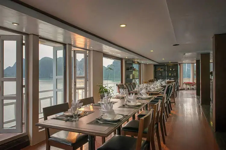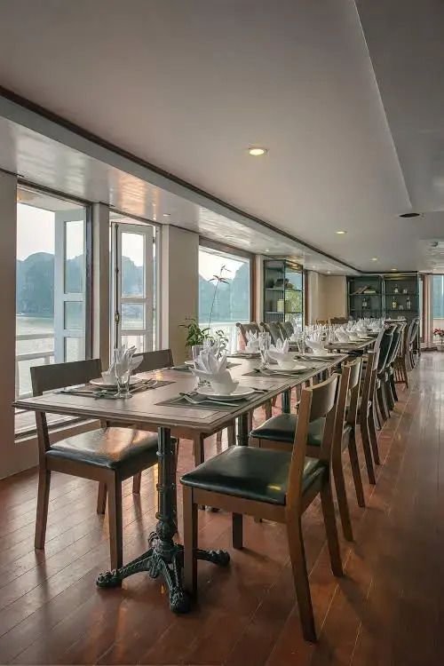 Пакеты «все включено» начинают действовать во время обеда, и заканчиваются после завтрака в день выезда. В пакет входит: - Услуги англоязычного гида на борту - Каюты Делюкс (Deluxe Cabin) и люксы (Suite) с кондиционером и собственной ванной комнатой - Фен и тапочки - Бесплатная минеральная вода - Питание «полный пансион» (блюда вьетнамской кухни по стандартному меню и блюда по меню а-ля карт) - Оборудование для катания на каяках и плавания (при наличии) - Кулинарное шоу - Занятие тай чи - Развлечения - Просмотр фильмов, настольные игры и ловля кальмаров - Средства обеспечения безопасности и оказания первой помощи - Входные и экскурсионные сборы - Страхование, налоги и сервисный сбор.,На борту работает бесплатный Wi-Fi, но интернет может быть недоступен из-за неблагоприятных погодных условий.