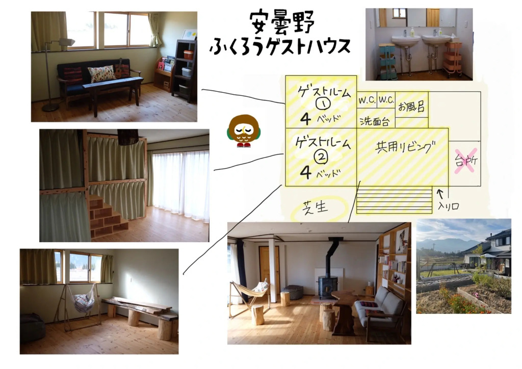 Отель Azumino Fukuro Owl Guest House 3 звезды, адрес на карте Адзумино, Azumino Fukuro Guesthouse, 7950-8 Hotaka, Azumino City, Nagano 399-8303, Japan, Matsumoto, с характеристиками номеров и возможностью онлайн бронирования на сайте ВашОтель.RU , цены проживания и удобства.