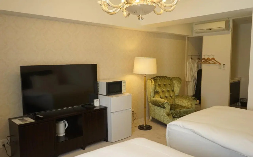 В номере вы найдёте телевизор и тапочки. Оснащение зависит от выбранной категории номера.
