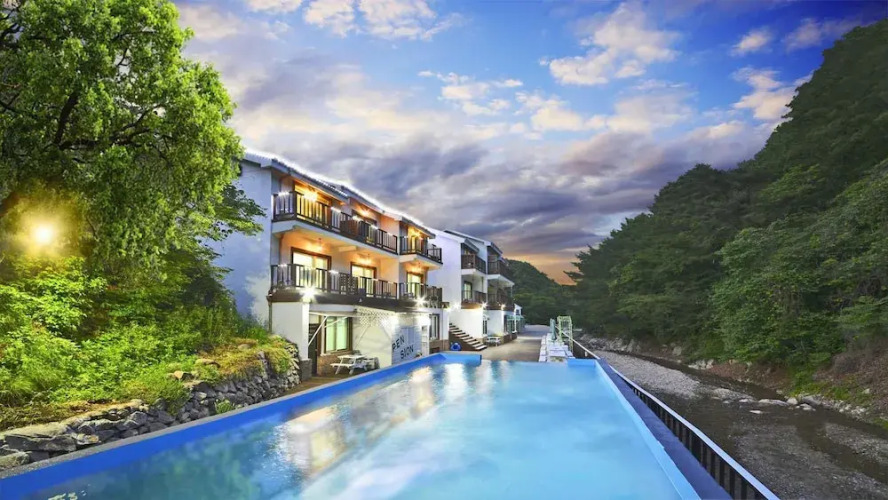 Отель Gyeongju Green Valley Spa Pension 3 звезды, адрес на карте Кенджу, 238, Sanedeulle-gil, Yangnam-myeon, с характеристиками номеров и возможностью онлайн бронирования на сайте vashotel.ru , стоимость проживания и удобства.