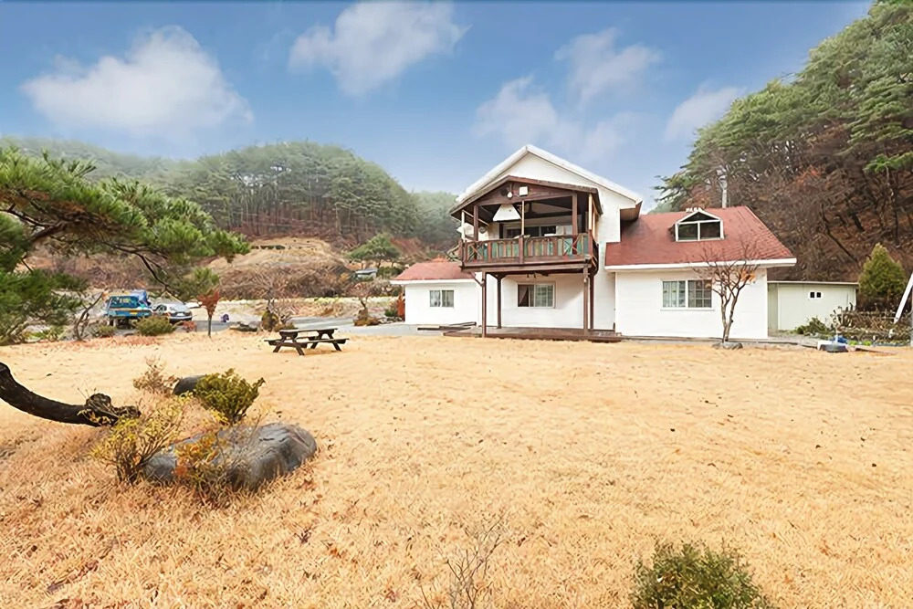 Отель Hoengseong White House Pension 3 звезды, адрес на карте Пхёнчан, 28, Gowon-ro 377beon-gil Dunnae-myeon, с описанием номеров и доступностью онлайн бронирования на площадке vashotel.ru , стоимость проживания и удобства.